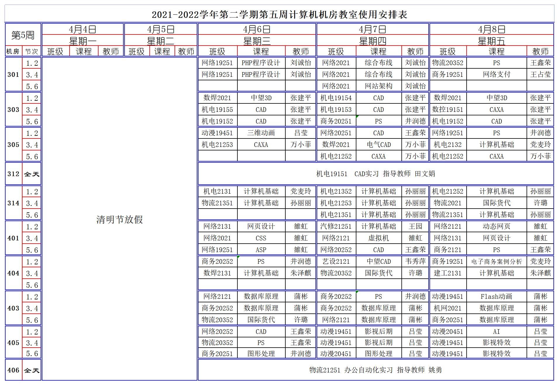 2021-2022學年第二學期第5周計算機機房教室使用安排表